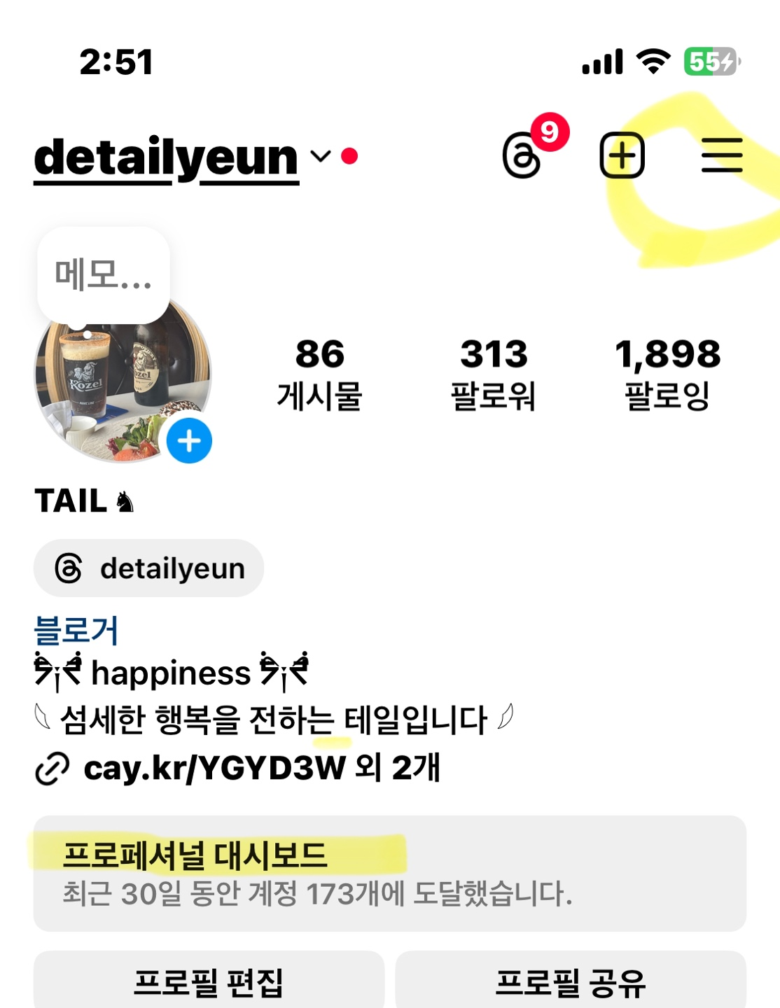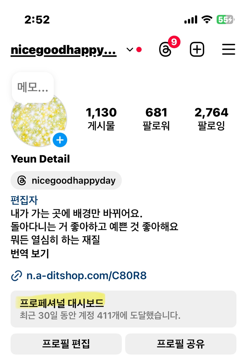 프로필 화면을 보셨을 때 이렇게 프로패셔널 대시보드가 있다는 것은 곧 여러분의 계정이 프로패셔널 계정이라는 것을 알 수 있게 해줍니다.