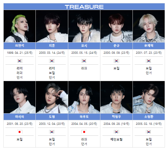 트레저의 멤버들은 한국과 일본 출신이 혼합되어 있어 글로벌 활동에 강점을 보이고 있습니다.