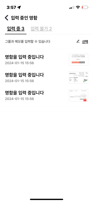 명함입력중 화면을 확인해보니 명함2건이 서로 겹쳐있는 것이 확인이 됩니다.