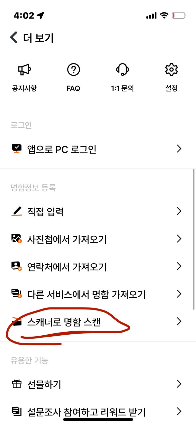 2. 하단의 [더 보기] > [스캐너로 명함 스캔]을 누릅니다.
