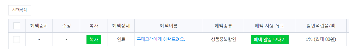 제가 설정해놓은 혜택이에요. 할인 적립율이 1%이고 최대 80원까지 적립가능한 걸로 설정을 해놨습니다.