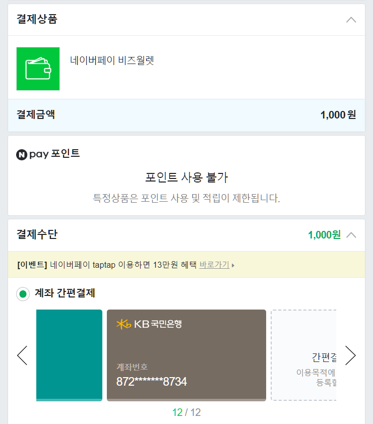 계좌로 지불할 경우 비즈월렛 연결계좌 등록하면 최대 200만원 까지 충전해둘 수 있어요.