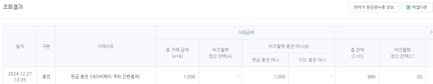 비즈월렛 충전머니가 1000원으로 변경된 것을 확인할 수 있고 20원이 지불되고 비즈월렛 잔액이 변경된 것까지 확인할 수 있습니다.