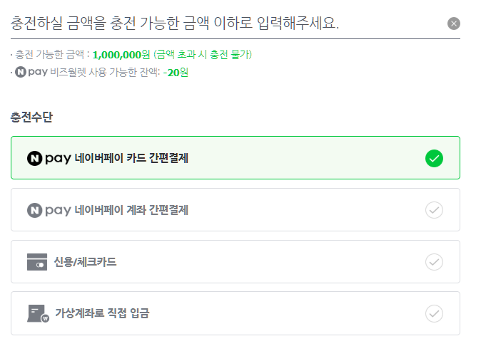 충전방법은 네이버페이를 통한 간편결제(카드, 계좌), 카드결제, 가상계좌로 직접 입금이 있습니다.