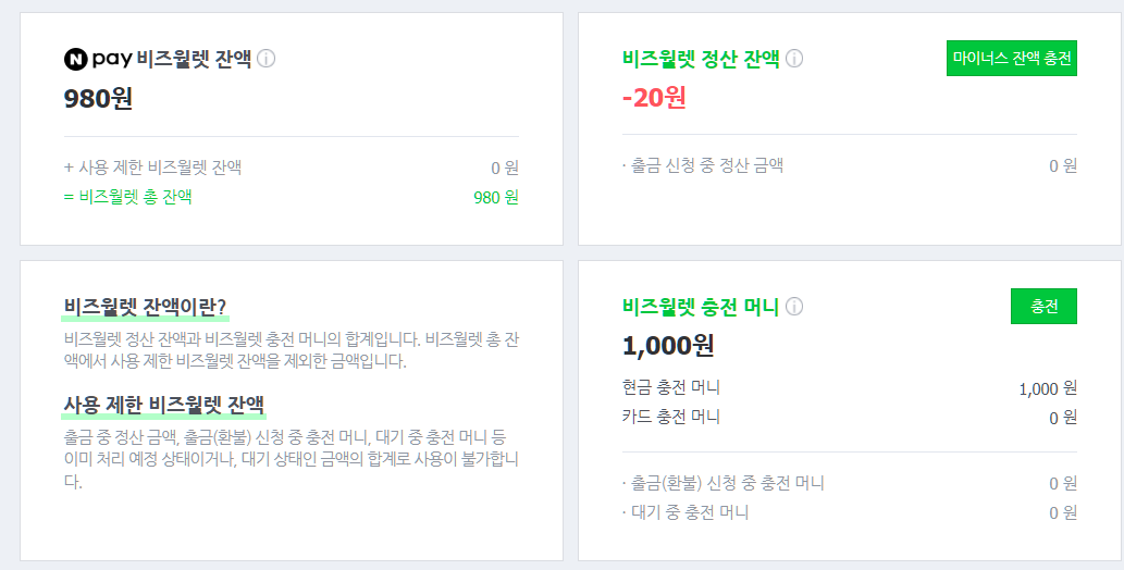 네이버페이 비즈 월렛을 충전 및 관리하는 메뉴에서 충전할 수 있습니다.