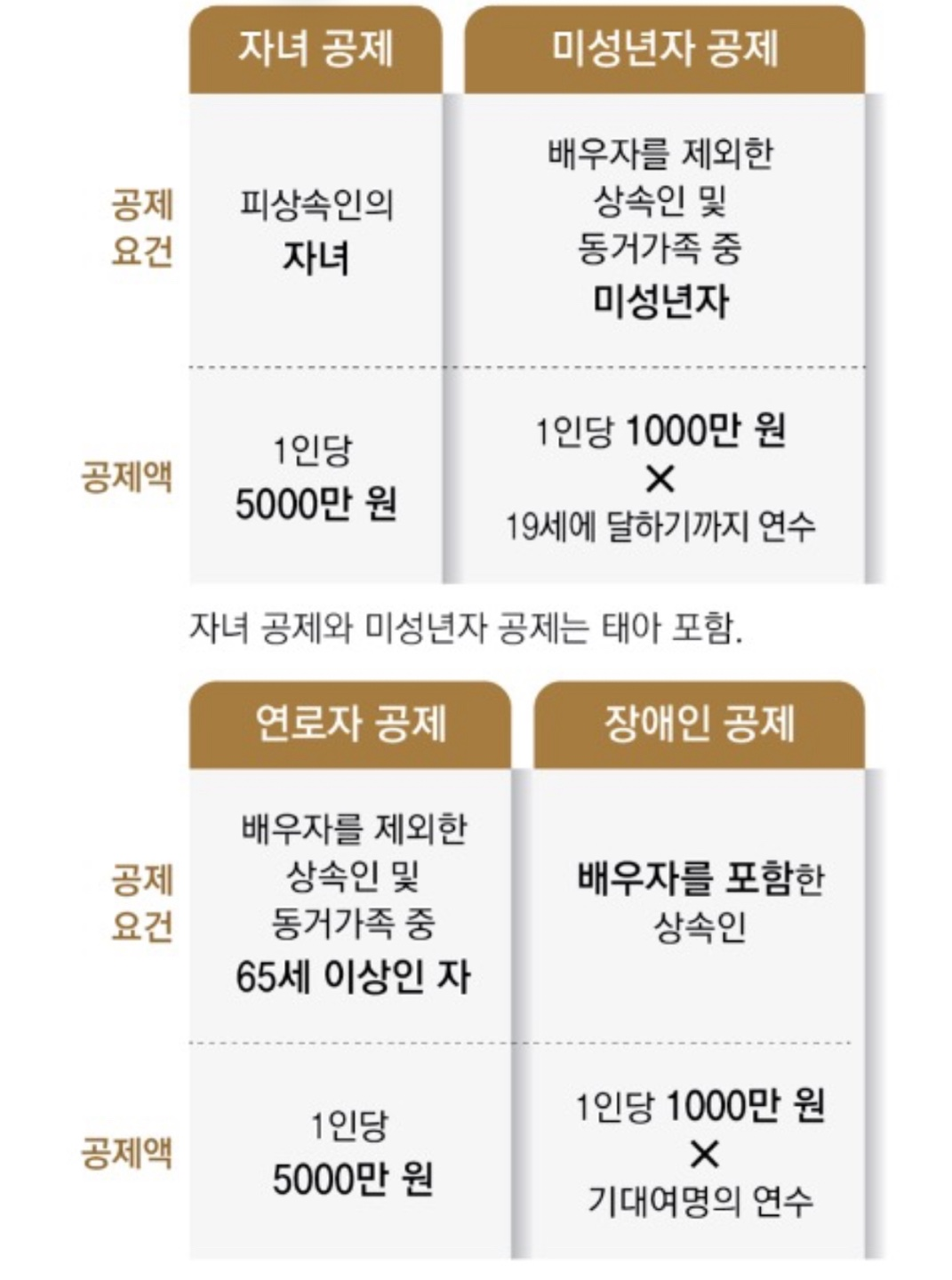 | 미성년자 공제 | 배우자 제외, 상속인 또는 동거가족 중 미성년자 ※ 태아 포함 |