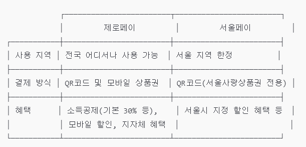 - 서울페이: 서울 지역 한정, 서울사랑상품권 전용.