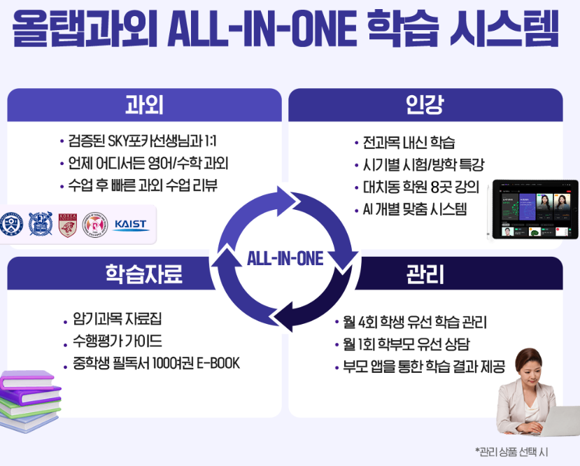 - 전문 강사진: 스마트올은 업계 유일의 최상위권 강의를 제공합니다. SKY 출신의 강사진이 1:1 과외처럼 맞춤형 강의를 제공하여, 학생의 수준과 학습 스타일에 맞춰진 교육을 받을 수 있습니다.