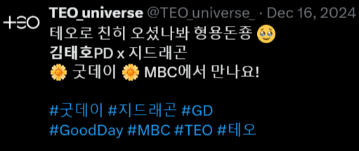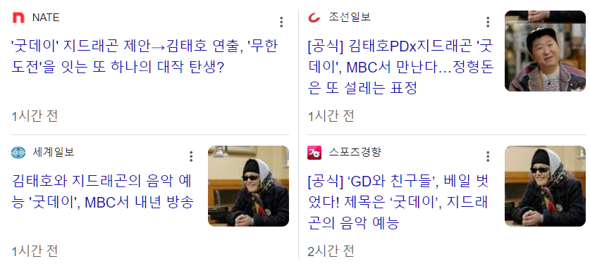 GD의 리더십과 협업 능력 강조GD가 중심에서 다양한 사람들과 협업하며 조율하는 모습이 프로그램의 핵심입니다. 이를 통해 GD의 예술적 감각과 리더십, 사람들과의 소통 능력을 강조할 것으로 보입니다. aespa, 부석순, 데이식스 등 아이돌 출연은 젊은 층과 K-팝 팬덤, 배우와 예능인은 음악 팬이 아닌 시청자들도 끌어들여 대중성을 확보합니다. 굿데이"는 단순한 음악 예능이 아닌, 다양한 분야의 인물들이 함께 협력해 음악과 문화의 융합을 보여주는 프로젝트로 GD의 창의성과 게스트들의 개성이 어우러지며, 2025년 상반기 가장 주목받는 예능 중 하나가 될 것입니다. 대중성과 깊이를 모두 잡는 기획의도가 포함되어있습니다.