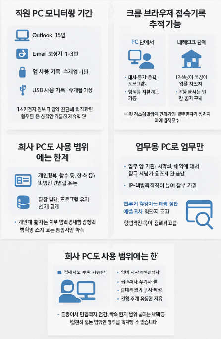 PC 사용기록 | 로그인 시간, 웹사이트 접속기록, 프로그램 사용 내역 등 | 회사 장비라는 점에서 모니터링 가능하나, 사전 고지 필요 |