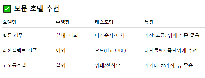 - 추천 호텔: 힐튼 경주 / 코오롱호텔 / 라한셀렉트 경주 (수영장+레스토랑 있음)
