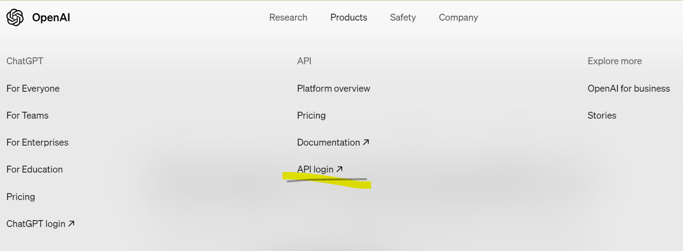 로그인 후에 OpenAI 웹사이트 상단 Product를 누른 후 API login을 클릭합니다.
