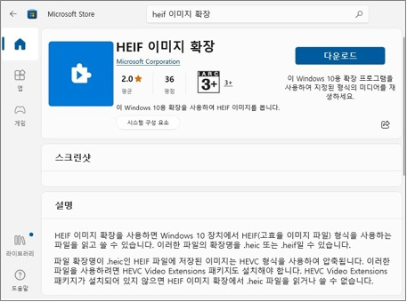 - 2) Microsoft Store에서 HEIF 이미지 확장 앱을 설치하세요.(윈도우 버전에 따라 이미 설치되어 있을 수 있습니다)