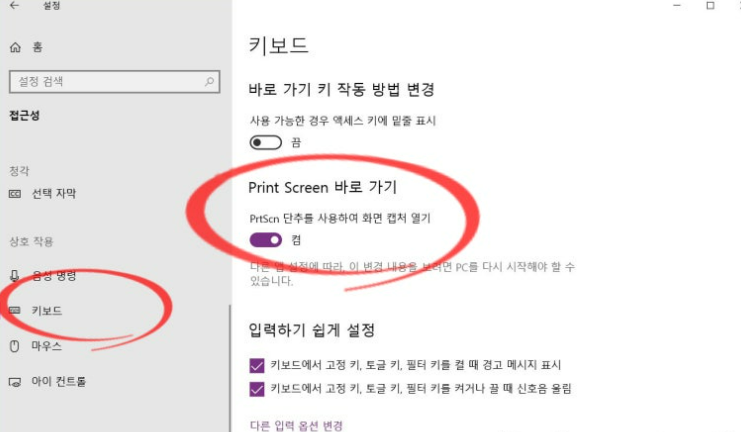 윈도우11에서는 스크린샷 기능이 “설정 → 접근성 → 키보드” 메뉴에서 Print Screen 키로 화면 캡처 열기 옵션이 꺼져 있으면 작동하지 않습니다. 이 부분을 켜주면 대부분 바로 해결됩니다.
