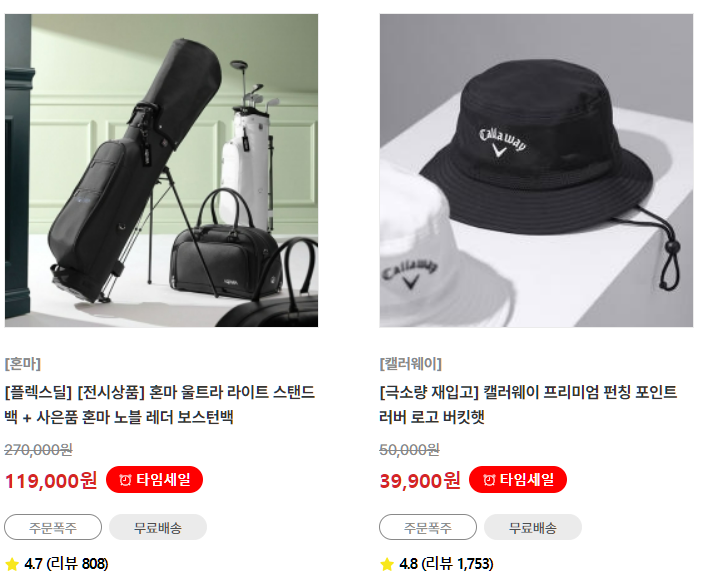 골프 애호가라면 꼭 방문해야 할 곳인대요. 다양한 골프용품을 저렴한 가격에 만나보세요. 레이저 거리측정기, 골프화, 골프백, 골프장갑, 골프클럽, 스윙연습기, 로스트볼, 골프공 등 정품 골프용품을 특가로 제공하며, 시간 제한이 있는 타임딜과 전시상품 특가로 할인폭이 큰 제품들이 참 많아요. 우리가 아는 켈러웨이나 혼마, 테일러, 미즈노 같은 고급 브랜드부터 시작해서 다양한 브랜드 모두 있어요.